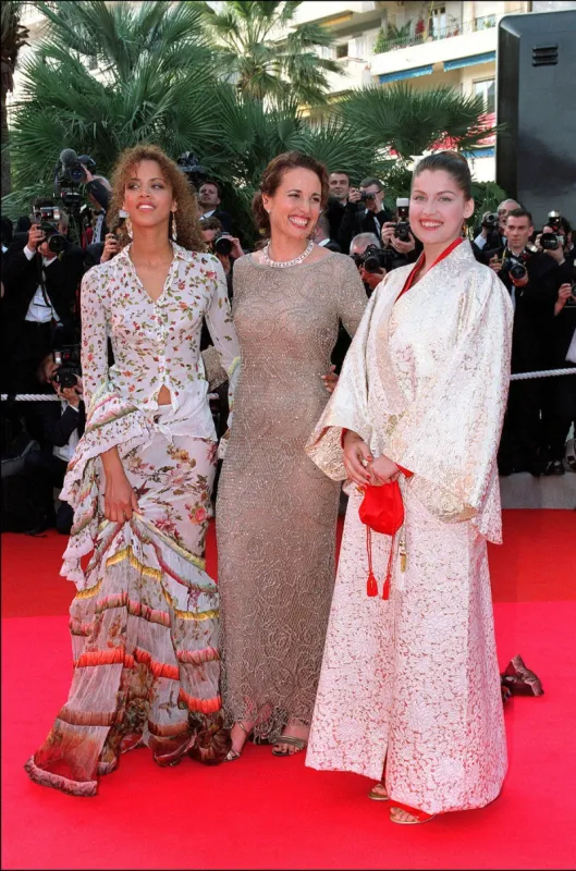 En 2001 lors du festival de Cannes, l'actrice Laetitia Casta est apparue auprès de Noémie Lenoir et Andie MacDowell dans un sublime kimono rouge et blanc.