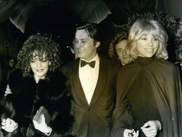Alain Delon entouré de son ex-fiancée Romy Schneider et de sa compagne Mireille Darc en 1973.