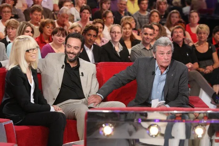 Mireille Darc, Anthony Delon et son père Alain Delon dans l'émission Vivement dimanche en 2008.