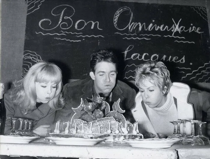 Mylène Demongeot, Jill Haworth et Jacques Charrier lors de la fin du tournage du film À cause, à cause d'une femme.