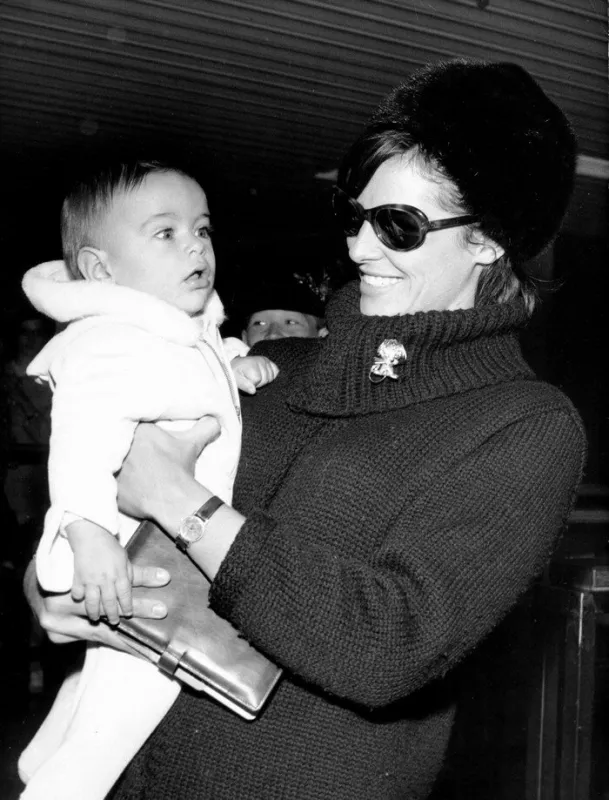 La comédienne Nathalie Delon portant son fils Anthony.