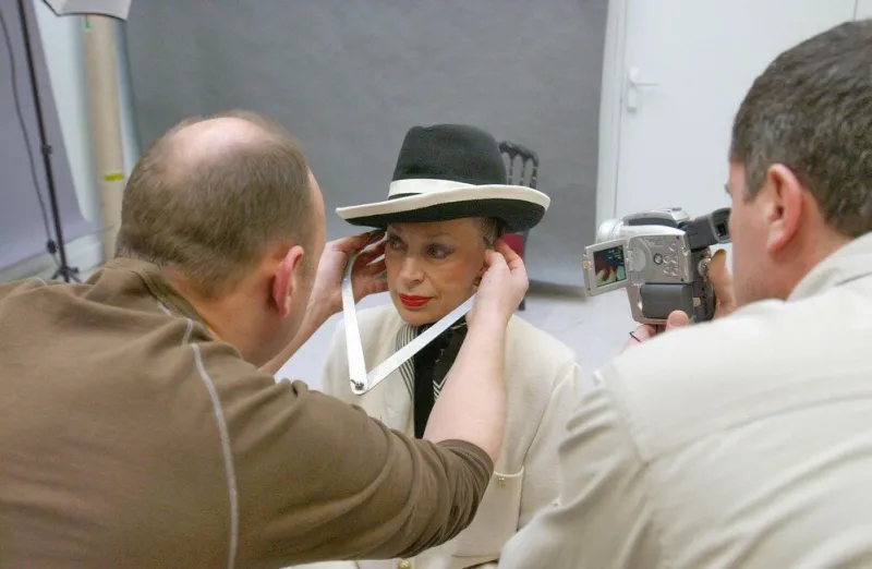 Geneviève de Fontenay dans les ateliers du Musée Grévin afin de prendre ses mensurations pour créer sa statue de cire.