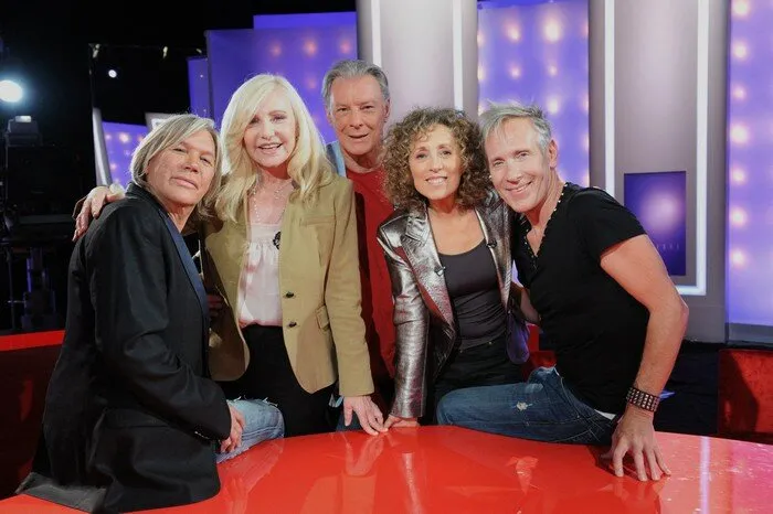 Patrick Juvet, Michèle Torr, Herbert Leornard, Mireille Dumas et Plastic Bertrand lors de l'enregistrement de l'émission Vie privée, vie publique en 2010.