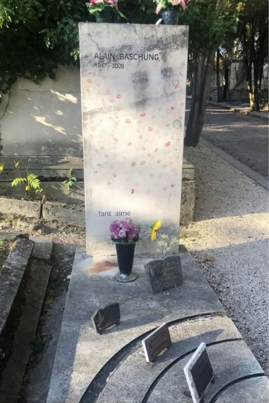 Le chanteur français Alain Bashung, décédé le 14 mars 2009 à 61 ans, continue d'attirer aujourd'hui de nombreuses admiratrices. Comme en témoignent les traces de rouges à lèvres laissées sur la stèle de l'artiste.