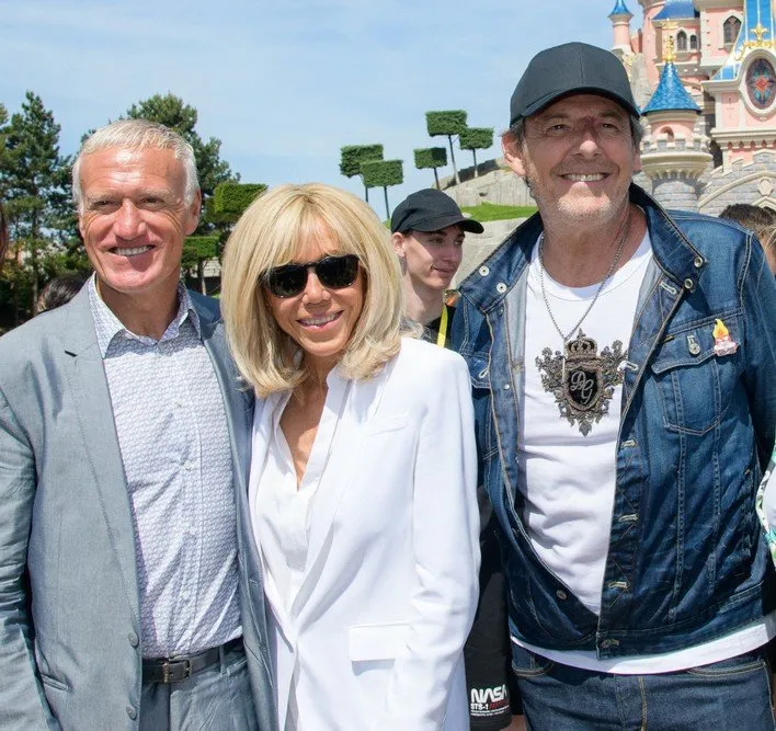 Brigitte Macron, Jean-Luc Reichmann et le parrain des Pièces Jaunes, Didier Deschamps, au parc Disneyland Paris le 18 mai 2022.