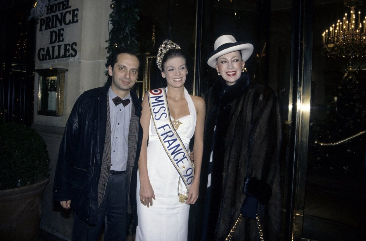La Savoyarde Laure Belleville pose avec l'écharpe de Miss France 1996 lors de son couronnement en compagnie de Geneviève de Fontenay en décembre 1995.