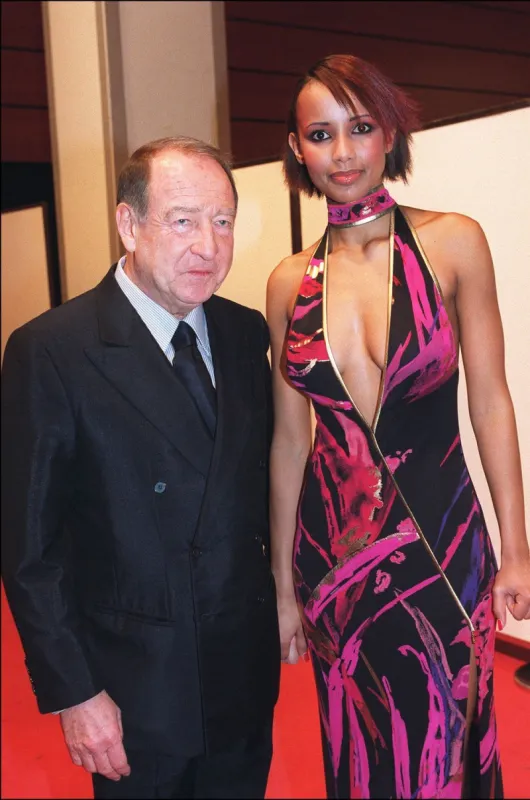 La divine Sonia Rolland prenant la pose dans une robe très sexy au côté de Daniel Tribouillard, PDG de Leonard, en 2001.