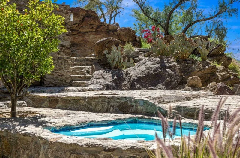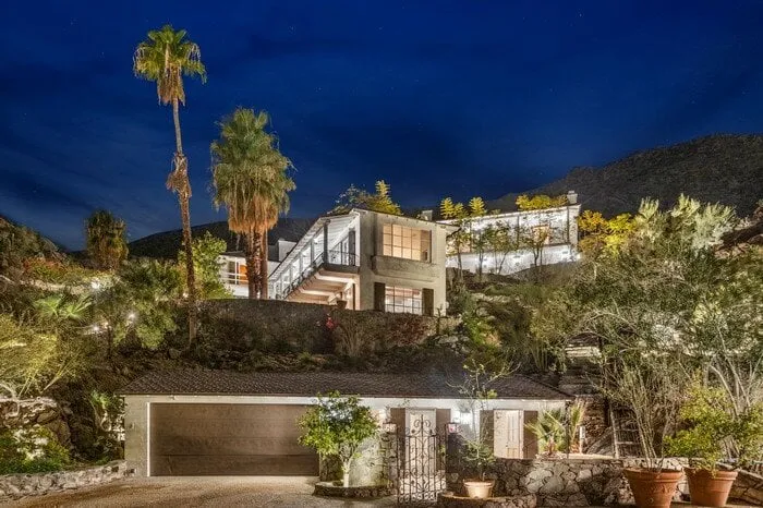 Son ancienne propriété, nichée dans le très chic quartier de Palm Spring, en Californie, fait partie des demeures les plus intrigantes du quartier. Il faut dire que les aménagements extérieurs et intérieurs sont des plus atypiques. Située à flanc de montage, surplombant ainsi le canyon Mesa, la propriété est un mélange de plusieurs matériaux, à la fois faites de récupération de bois, mais également de roches naturelles. Autre originalité de cette propriété : l'accès se fait via un funiculaire privé qui permet de gravir le flanc de la colline.