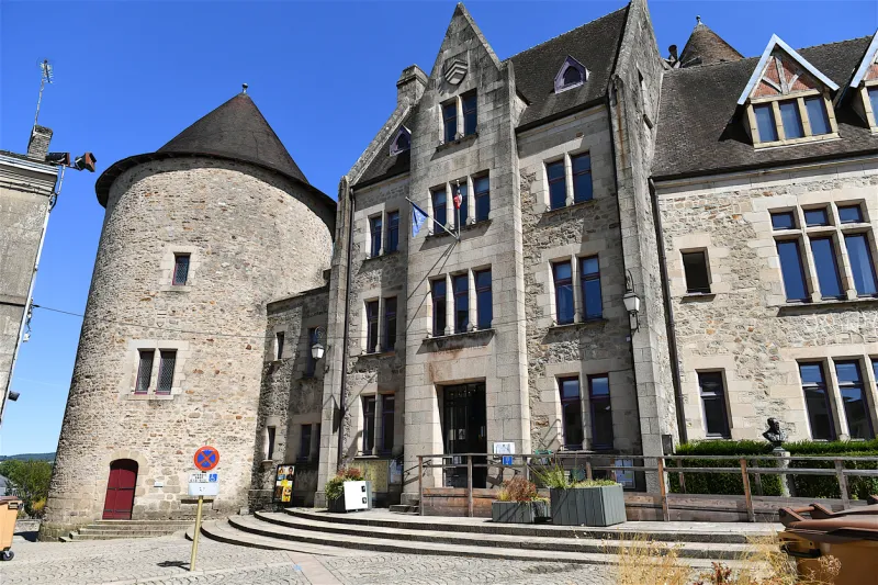 La mairie de Bourganeuf dans la Creuse, lieu de naissance de Thierry Ardisson. A propos de son père, il disait dans sa biographie "Voir le sien se mettre à genoux pour murmurer des choses à Dieu c'est une sensation très étrange [...] Je ne prends jamais sa piété pour de la faiblesse."