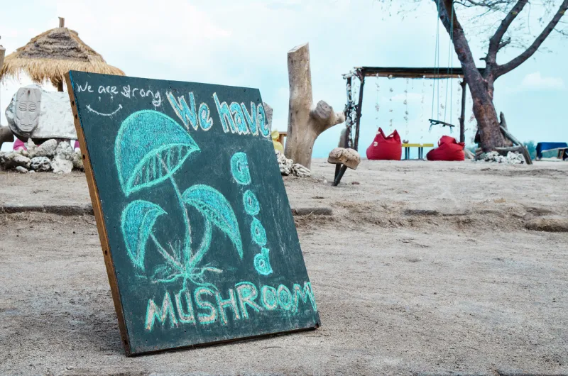 A Bali "Parce que Katmandou, c'est ringard. Et Goa, démodé", Thierry Ardisson goûte à touts les drogues. "Ici, la défonce commence au réveil avec les fameuses omelettes aux champignons hallucinogènes."