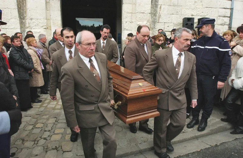 Le cercueil de Jacques Villeret quittant l'église où ont eu lieu ses obsèques, le 3 février 2005.