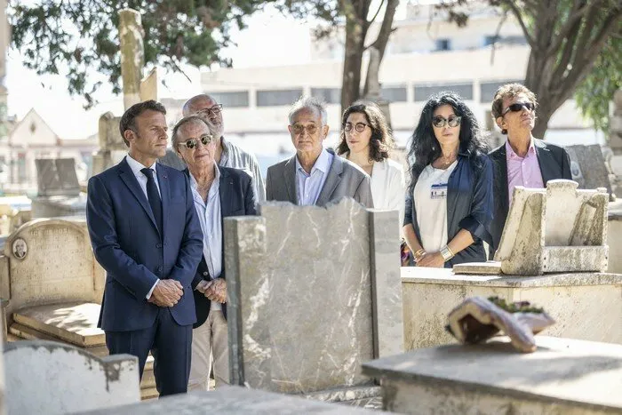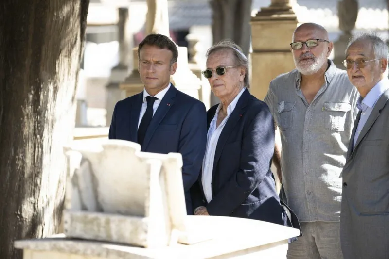 Le président de la République Emmanuel Macron devant la tombe du comédien Roger Hanin en août 2022.