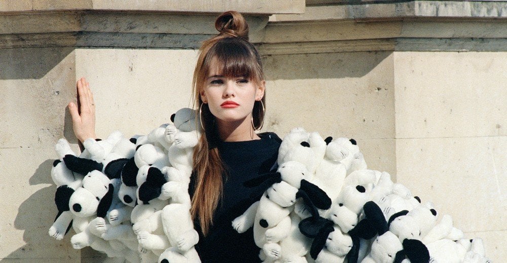 La star française présentant le blouson "snoopy" créé par le couturier Jean-Charles de Castelbajac en 1989.