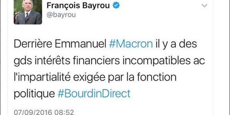 Reproches sur son appartenance au gouvernement sortant, comparaison avec François Fillon, désaccords sur ses propositions, François Bayrou n'a pas été tendre avec Emmanuel Macron. Ici, dans un tweet de septembre dernier, il reprochait au candidat d"En Marche" ses anciennes activités de banquier d'affaires.