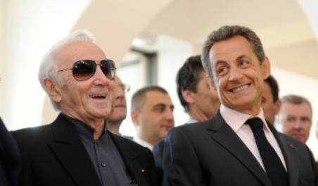 Nicolas Sarkozy et Charles Aznavour lors d'un spectacle de chant à Erevan (Arménie) en 2011