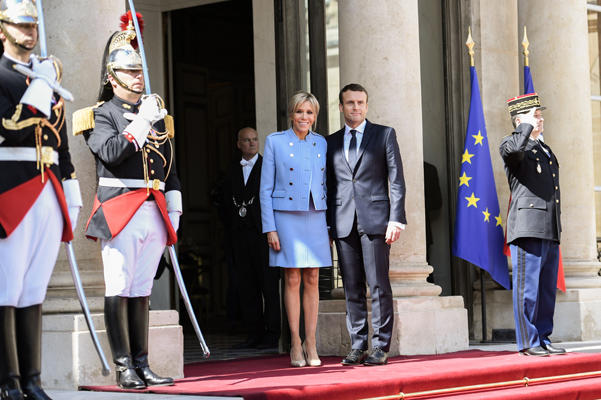 le président nouvellement élu emmanuel macron (r) pose avec son épouse brigitte trogneux au palais présidentiel d'elysée après la remise et avant la cérémonie d'inauguration le 14 mai 2017 à paris photo afrique stephane de sakutin