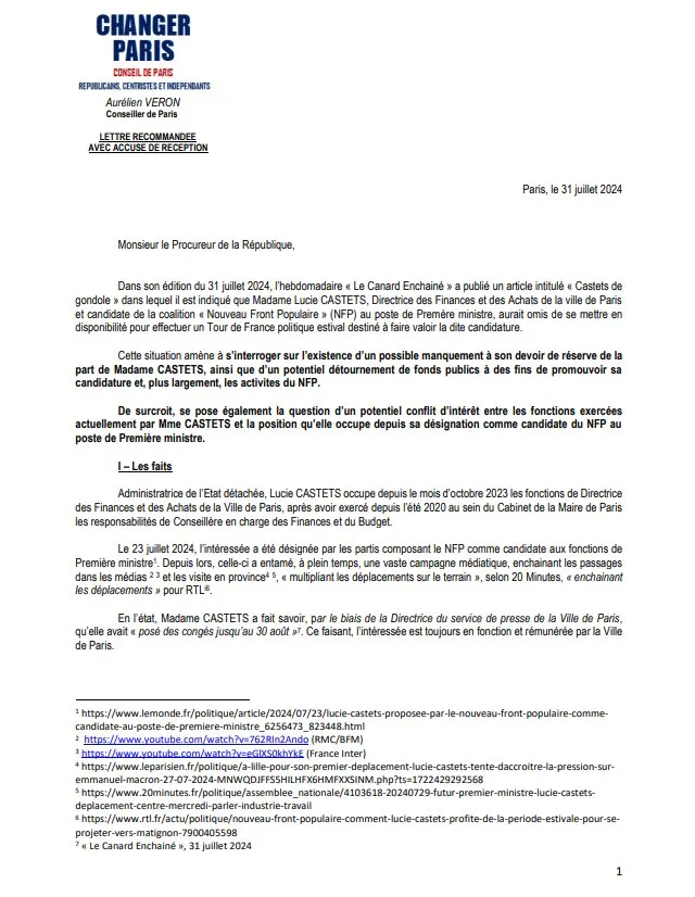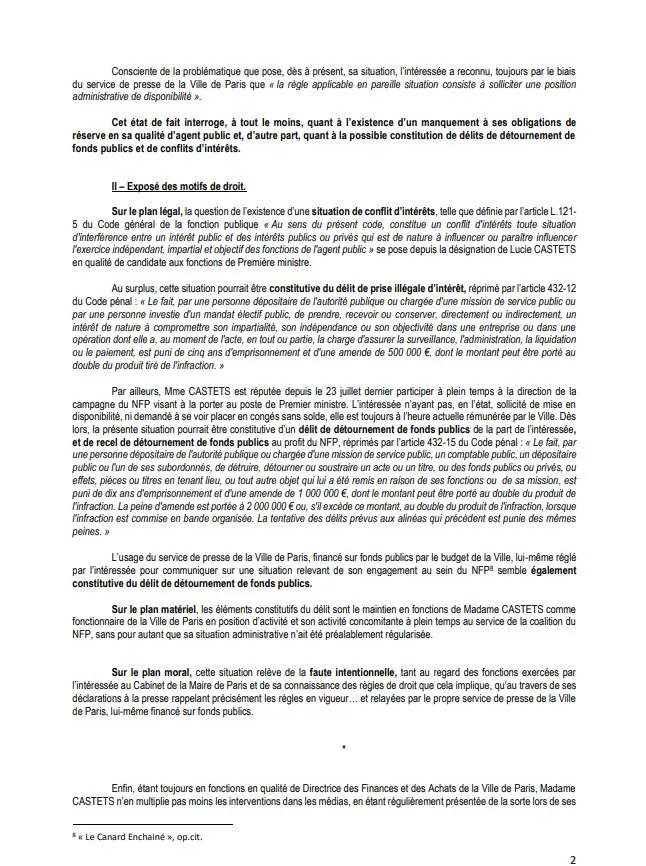 Pour résumer, Lucie Castets aurait continué d'être rémunérée par la Ville de Paris et utilisé son budget à des fins personnelles : sa campagne pour le poste de Premier ministre, ponctuée de déplacements à Lille ou à l'usine Duralex dans le Loiret. Ce qui contreviendrait potentiellement au devoir de réserve inhérent à son statut de (haut) fonctionnaire. L'utilisation du service de presse de la Ville de Paris pour sa communication de candidate constituerait un détournement de fonds publics.