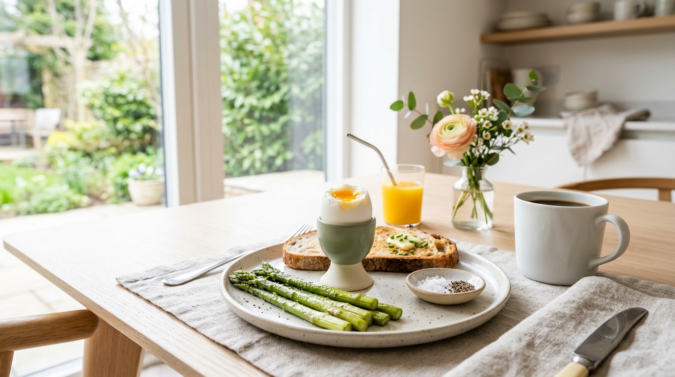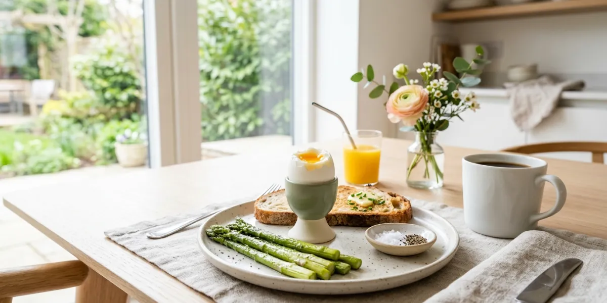 - La recette express "énergie" : Préparez des mouillettes d'asperges vertes à tremper dans un œuf à la coque. Ce duo parfait entre protéines et fibres est d'ailleurs recommandé par le ministère de l'Agriculture pour composer un déjeuner léger mais hautement nutritif.
