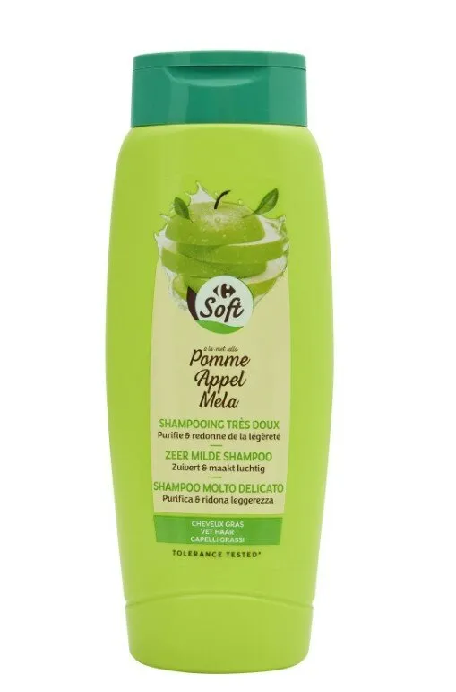Le shampoing Soft pomme, une marque Carrefour, obtient un Cosméto'Score de C (.à utiliser de façon occasionnelle ou en cas de besoin spécifique). Il est noté C dans les deux catégories, santé et environnement. Il contient 17 ingrédients. Prix indicatif : 1,29 euros/500 ml.
