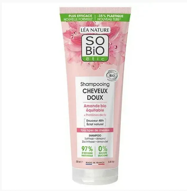Le shampoing So Bio Étic de Léa Nature pour cheveux doux à l'amande bio équitable obtient un Cosméto'Score de C (à utiliser de façon occasionnelle ou en cas de besoin spécifique). Il est noté D dans la catégorie santé (utilisation déconseillée ou à utiliser avec parcimonie pour des besoins spécifiques) et B dans la catégorie environnement (à utiliser de façon raisonnée). Il contient 29 ingrédients et possède le label Bio Cosmos Organic. Prix indicatif : 5,20 euros/250 ml.