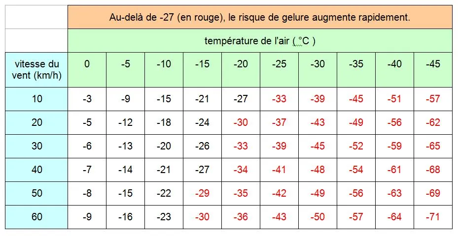 Pour avoir une idée de la température ressentie ou indice de refroidissement éolien, les météorologues font un calcul en fonction de la température de l’air et de la vitesse du vent. Un tableau existe d’ailleurs avec pour exemple le Canada. Ainsi, quand la température extérieure est de 0°C et que le vent souffle à 10km/h, la température ressentie est de -3°C. Un chiffre qui tombe à -15 quand la température extérieure est de -5°C que le vent souffle à 50 km/h.