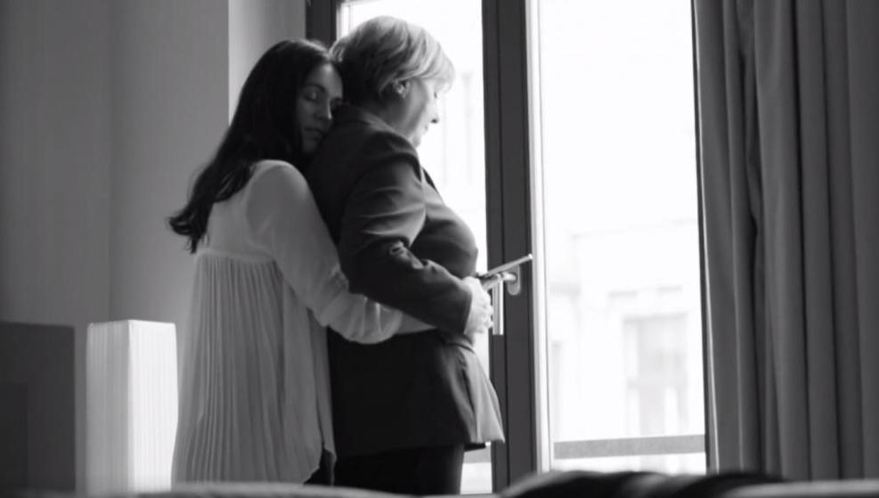 Sur la première vidéo accompagnée de la mention "Toute l’Europe déteste Angela Merkel ? Oui, sauf cette femme ?", on aperçoit une porte qui s’ouvre sur une chambre dans laquelle se trouve Angela Merkel de dos, ou plutôt son sosie, en train de consulter son smartphone face à une fenêtre. Une jeune femme se place alors derrière elle et la prend dans ses bras. Elle l’embrasse ensuite dans la nuque.