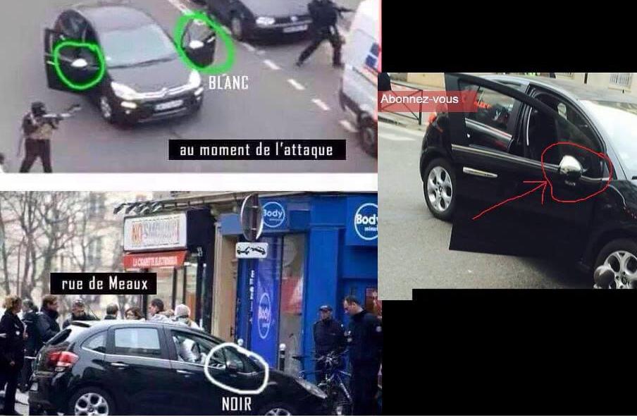 "Regardez ces deux images, les rétroviseurs ne correspondent pas !" s’alarme un internaute. En cause, la couleur des rétroviseurs observée au moment de l’exécution du policier comparée à celle qui apparaît sur la photo de la même voiture rue de Meaux. Un montage de cette comparaison tourne alors en boucle sur les réseaux sociaux et devient l’argument massue des adeptes de cette théorie.