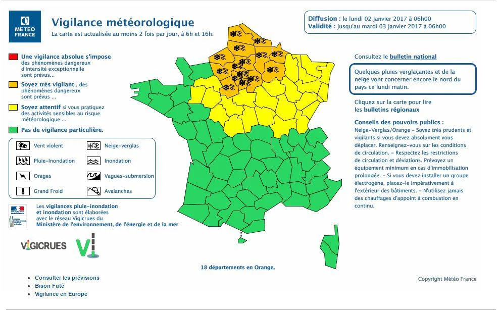 L’alerte orange devrait être maintenue dans les 18 départements au moins jusqu’à mardi matin, 6 heures.