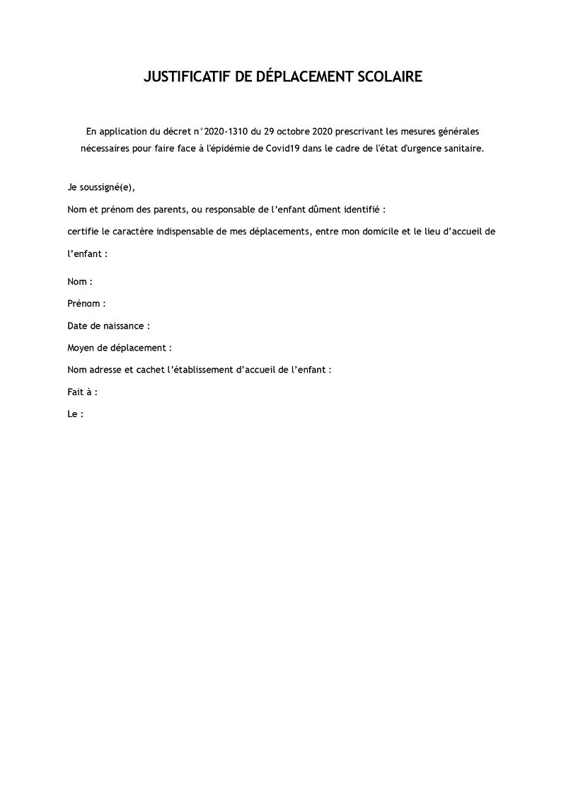 Justificatif de déplacement scolaire