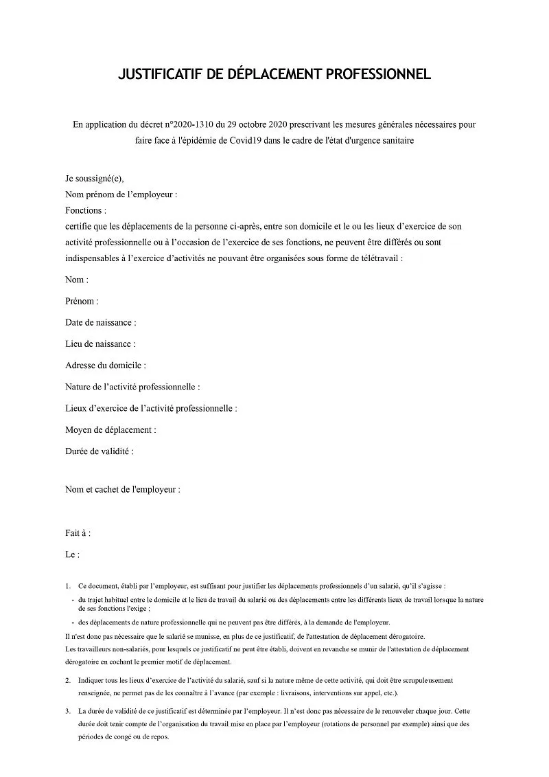 Justificatif de déplacement professionnel