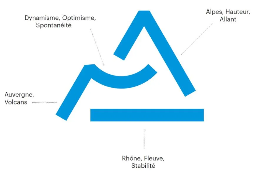 Sur le logo en question, on peut voir une forme qui ressemble à un grand "A" blanc sur un rond au fond bleu. Comme l'explique France Bleu, les traits formants le pictogramme n'ont pas été choisis au hasard. Le trait en bas rappelle le fleuve du Rhône (signifiant la stabilité), le chapeau pointu rappelle les Alpes (signifiant la hauteur, l'allant), et enfin le trait à gauche évoque l'Auvergne, les volcans et le dynamisme.