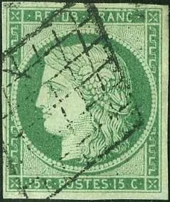 Dans la même série, le timbre 15 centimes vert est côté à 28 000 euros en 2021.