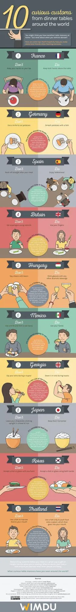 Il y a des choses à ne pas faire ! Le site de voyage Wimdu a réalisé une infographie des us et coutumes à respecter lorsque vous passez à table lors d'un voyage à l’étranger.