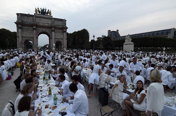 Jeudi soir, après un jeu de piste dans les rues de Paris, les participants ont appris au dernier moment le lieu du "dîner en blanc". Plus de 10 000 personnes tout de blanc vêtues se sont retrouvées dans au Palais Royal sans aucune autorisation apportant tables, chaises et de quoi manger. Tandis qu’un groupe de dissidents a organisé au même moment un dîner similaire aux Jardins des Tuileries, réunissant entre 3000 et 4000 personnes. Ces dîners non-autorisés existent depuis 1988 et ont lieu à chaque édition dans des lieux insolites comme la place de la Concorde, le parvis de Notre-Dame ou encore les Champs-Elysées. Comme le veut la tradition, les participants font tourner leur serviette pour marquer le début des festivités. Il ne s'agit pas d'un pique-nique mais d'un dîner chic et mondain où les assiettes en plastiques sont prohibées. Une fois le repas terminé, les participants sont tenus de tout remettre en ordre, ce qui explique la tolérance des autorités à l’égard de cet événement. Le concept s’est exporté à l’étranger, il en existe désormais dans 20 pays et 50 villes dont New York, Bombay ou encore Copenhague.