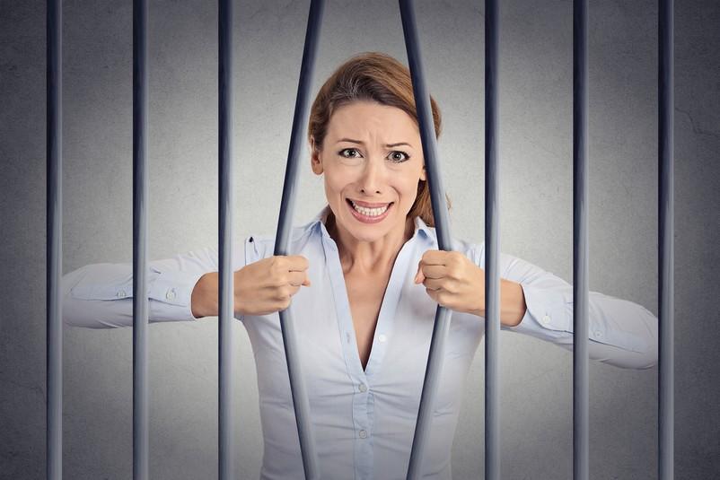 stressé, désespéré, femme affaires, courber, barres, de, elle, prison, cellule, gris, fond, vie, limites, loi, violation, violation, impôt, évasion, conséquences, concept, figure, expression, émotion