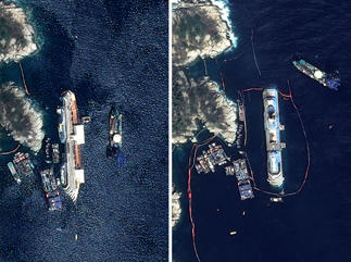 La compagnie EADS a immortalisée l’opération, et propose une juxtaposition de deux captures satellites de la côte, avant et après le redressement du Costa Concordia le 17 septembre dernier. La photo laisse d’ailleurs clairement voir le dispositif pharaonique mis en place. Une image impressionnante et émouvante que Planet.fr vous propose de découvrir.