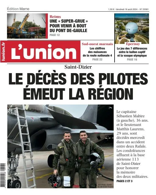 L'Union propose ce vendredi de revenir sur le décès du capitaine Sébastien Mabire, 36 ans, et de son apprenti, Matthis Laurens, 29 ans, ce mercredi 14 août 2024. Leur rafale est entré en collision avec un autre en Meurthe-et-Moselle. Le pilote du second avion a pu s'échapper à temps de la cabine et a été retrouvé vivant grâce à une balise GPS. Sur place, l'émotion est encore très forte : "les condoléances affluent (...) pour honorer la mémoire des deux militaires" est-il précisé.