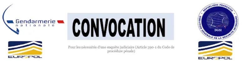 En tête de la lettre, vous retrouverez le mot "CONVOCATION" inscrit en gras et en lettres capitales, comme pour donner un air grave et urgent au document. Le logo de la gendarmerie nationale ainsi que celui de la Direction générale de la Sécurité intérieure (DGSI) sont apposés, aux côtés de non pas un, mais deux logos Europol. En transparence, sous la mention "Convocation", vous retrouverez la phrase suivante : "Pour les nécessités d'une enquête judiciaire (Article 390-1 du Code de procédure pénale". Tout au long de la lettre, de nombreux articles de loi sont mentionnés comme argument d'autorité pour donner plus de crédibilité à l'escroquerie.