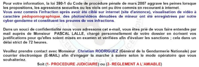 Dans leur lettre, les escrocs vous indiquent que vous êtes visé par des poursuites judiciaires pour des faits de pédopornographie, de pédophilie, d'exhibitionnisme, de cyberpornographie et de trafic sexuel. "Vous avez commis l'infraction après avoir été ciblé sur internet (site d'annonce), visualisation de vidéo à caractère pédopornographique, des photos/vidéos dénudées de mineur ont été enregistrées par notre cyber-gendarme et constituent les preuves de vos infractions", peut-on lire dans la missive. Ensuite, le document vous invite à prendre contact avec le général de la gendarmerie nationale par courrier électronique à une adresse Gmail, en vous laissant deux possibilités : la procédure judiciaire ou le réglement à l'amiable.