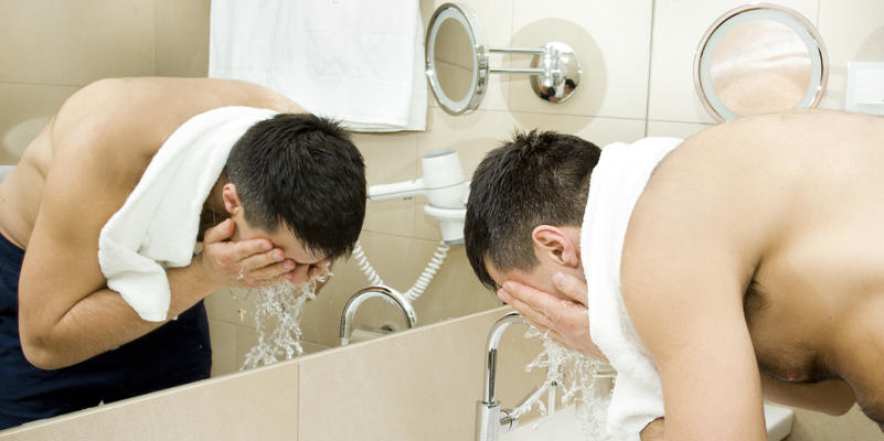 homme séduisant, laver le visage dans la salle de bain hôtel