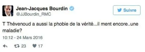 En mars 2016, l'animateur vedette de BFMtv/RMC avait eu maille à partir avec Thomas Thévenoud, éphémère secrétaire d'Etat chargé du commerce extérieur dans le gouvernement Valls II. Dans un tweet publié le 24 mars, Jean-Jacques Bourdin avait écrit : "T. Thévenoud a aussi la phobie de la vérité... il ment encore... une maladie ?" En cause, des passages du livre de l'ancien secrétaire d'Etat dans lesquels il montre un côté égotique du journaliste.