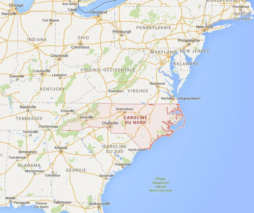 Sa superficie est de 139 509 km2, soit l'équivalent de la région Grand Est + la région Aquitaine élargie. C'est dire s'il y a de l'espace. Pour les accros à la géographie, sachez que la Caroline du Nord est bordée à l'Est par l'Océan Atlantique, la Géorgie au Sud-Ouest, le Tennessee à l'Ouest, la Virginie au Nord et la Caroline du Sud... au Sud.