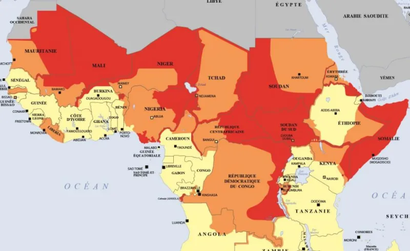 En dessous du Maghreb, le quai d'Orsay déconseille aux voyageurs de se rendre en Mauritanie, au Mali, au milieu des frontières entre le Niger, le Nigeria et le Tchad (présence de la secte islamiste Boko Haram), à l'est de la République centrafricaine, au Soudan (et Soudan du sud), ainsi qu'en Somalie.