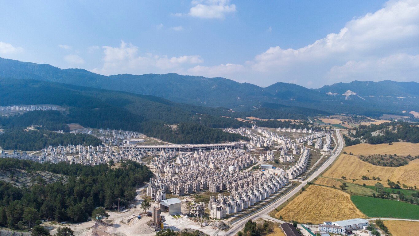 Nous sommes au cœur de la province montagneuse de Bolu au nord-ouest de la Turquie, dans la ville thermale de Mudurnu, célèbre et prisée pour ses sources chaudes et ses eaux réputées curatives. Là, des centaines de villas mitoyennes inspirées des châteaux des plus beaux contes de fées se dressent en rangées impeccables, offrant un spectacle hors du temps.