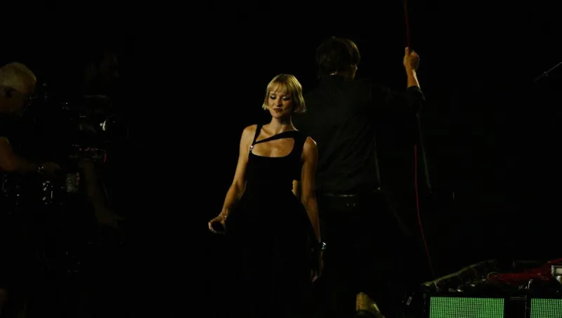 La chanteuse belge Angèle est apparue accompagnée du groupe Phoenix et du DJ Kavinsky pour interpréter le titre « Nightcall » qui a enflammé le Stade de France.