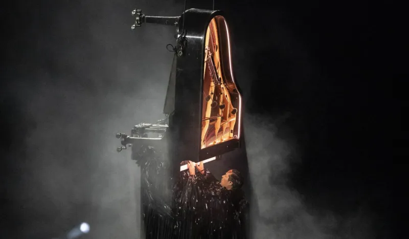 Suspendu à la verticale dans le ciel du Stade de France, le pianiste Alain Roche a interprété l’hymne d’Appolon, en compagnie du chanteur lyrique Benjamin Bernheim.