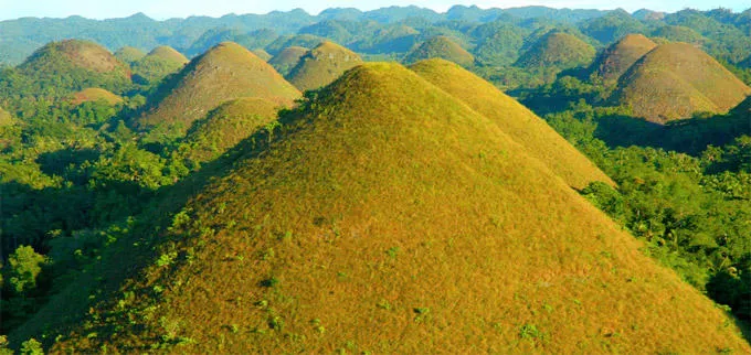 Les "Montagnes de chocolat", sur l'île de Bohol, ce sont en fait 1268 collines de schiste, souvent verdoyantes, qui changent de couleur en fonction de la chaleur et des rayons du soleil. La légende raconte que le géant Arogo est tombé amoureux d'une jeune femme prénommée Aloya. Celle-ci étant déjà prise, le géant fit tuer son compagnon et la pris pour épouse. Malheureusement, elle mourra de chagrin. Arogo, anéanti, pleura toutes les larmes de son corps et en tombant, celles-ci formèrent les fameuses collines.