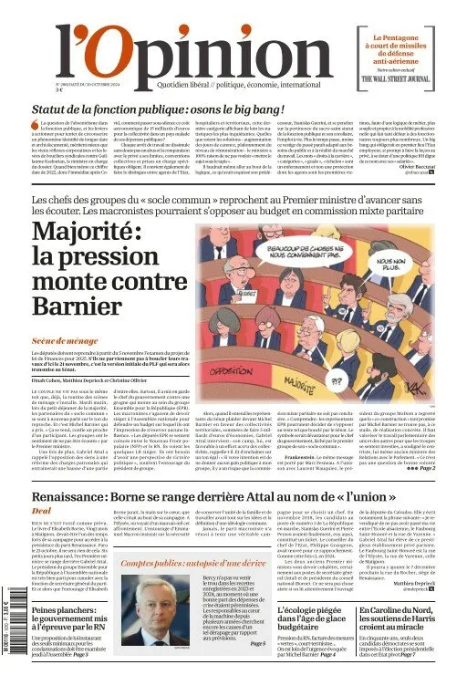 Et si les alliés de Michel Barnier ne suivaient plus leur "gourou" ? Selon L'Opinion, le Premier ministre serait progressivement mis sous pression, avec une majorité qui ne serait plus toujours en accord avec ce dernier. En pleine négociation du projet de loi de finance (qui reprendra le 5 novembre), les députés apparaissent plus divisés que jamais, mettant les mesures et les projets pour le pays dans une immense incertitude.