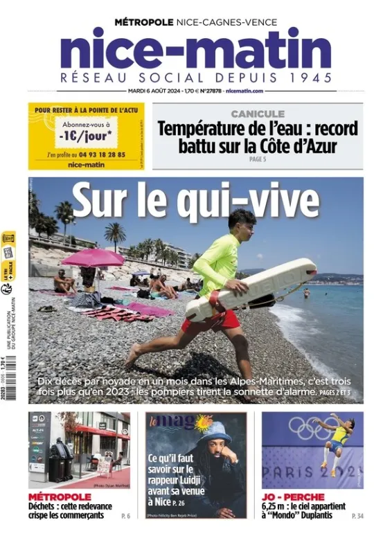 À la Une de Nice-Matin ce mardi 6 août 2024, les sauveteurs sur le "qui-vive" face à l'augmentation du nombre de noyades, notamment dans les Alpes-Maritimes où les noyades sont trois fois plus nombreuses que l'an passé à la même période. Dans une précédente revue de presse, c'était le journal Corse-Matin qui faisait état d'un constat similaire sur l'Ile de Beauté. La vigilance doit être de mise pour les baigneurs, qui sont vivement invités à se baigner dans les zones surveillées.