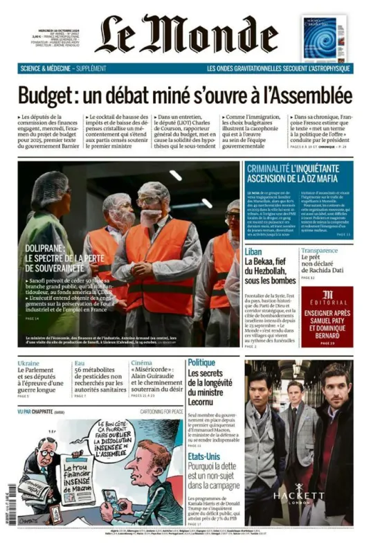 À la une du Monde ce mercredi 16 octobre, le début de l’examen du budget 2025 par les députés de la commission des finances. Parmi les points clés de ce budget, celui accordé à la hausse des impôts, le tout associé à une baisse globale des dépenses. L’objectif : économiser 60 milliards d’euros de manière à ramener le déficit à 5 % du PIB en 2025. (Il est estimé à 6 % cette année).